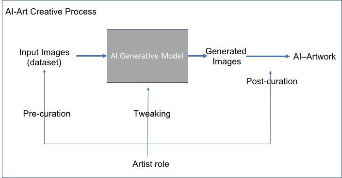 Understanding this process is crucial in characterizing what AI art really is. If we look at the creative process overall, not just the resulting images, AI art falls cleanly into the category of Conceptual art. The art is not just in the outcome, the art is in the process that leads to that, including the curated dataset, the choice of the algorithm and its parameters, and the post-curation.